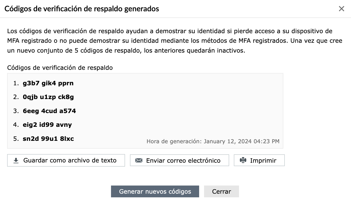 Para generar el código MFA, seleccionar la opción “Generar códigos de verificación de respaldo de un solo uso”