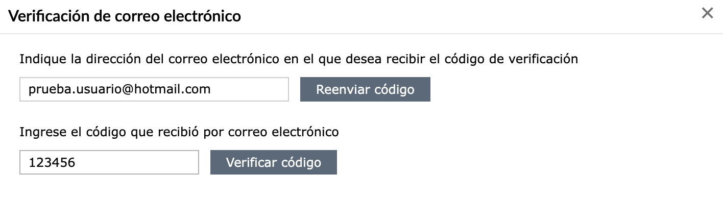 Se desplegará una pantalla en la cual le indicará que agregue el correo a adicionar; una vez ingrese este seleccione la opción “Reenviar código” y revise en su Buzón que haya recibido el código correspondiente, agréguelo en la casilla de Verificación de Código y seleccione la opción “Verificar código”