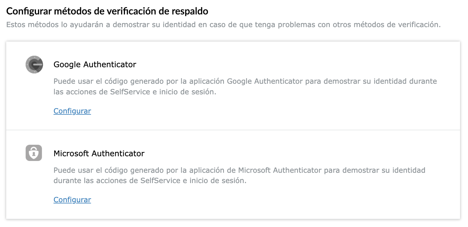 Para agregar un nuevo método de verificación alterno a los ya registrados, ubíquese en la sección de “Configurar métodos de verificación de respaldo” y seleccione Google Authenticator